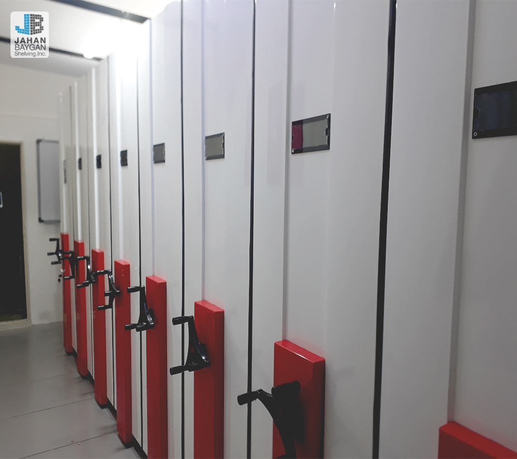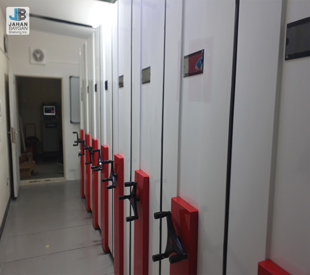- ۹ بلوک ریلی متحرک: هر بلوک به طول ۳.۵ متر طراحی و نصب شده است. حرکت نرم و دقیق این بلوکها باعث میشود فضای مورد نیاز بین قفسهها تنها هنگام استفاده ایجاد شود، و در سایر لحظات قفسهها به هم فشرده باشند.