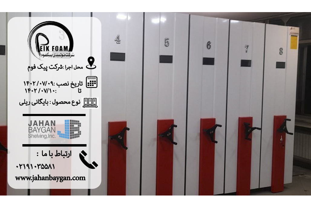 فایل بایگانی ریلی پیک فوم در مهرماه ماه سال ۱۴۰۲ توسط شرکت تولیدی جهان بایگان اجرا شد که شامل 7 بلوک متحرک 3 متری، 1 بلوک ثابت 3 متری در 6 طبقه و 1 درب و قفل مرکزی مباشد. ظرفیت این مجموعه برای 2700 عدد زونکن است. ارتفاع کل بلوک بایگانی 250 سانتی است و این در حالی است که ارتفاع محیط 283 سانتی متر است و این نهایت استفاده از فضا را میرساند.